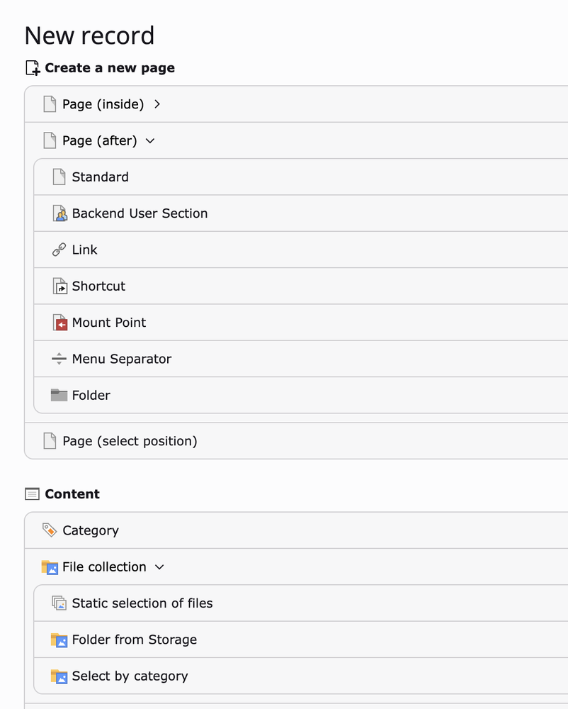 Um das Erstellen von Inhalten zu erleichtern, kann bereits im Wizard der Typ ausgewählt werden. Dadurch erspart man sich die spätere Auswahl und den notwendigen Reload.