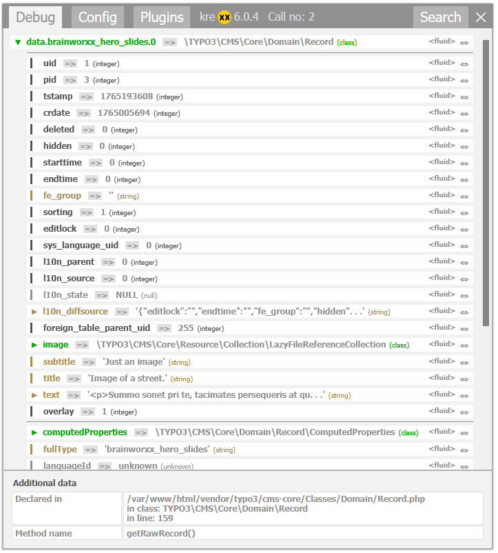 Ein Debugger für Fluid-Templates ist unverzichtbar, um Variablen und deren Inhalte im Template nachvollziehen zu können. TYPO3 stellt hierfür das ViewHelper-Element <f:debug> bereit, das die verfügbaren Daten in menschenlesbarer Form ausgibt. Bei der Arbeit mit Objekten, die dynamische Werte enthalten, stößt <f:debug> jedoch an seine Grenzen: Es werden nur die internen Eigenschaften angezeigt, ohne zu prüfen, ob weitere, dynamisch geladene Werte existieren oder erreichbar sind.