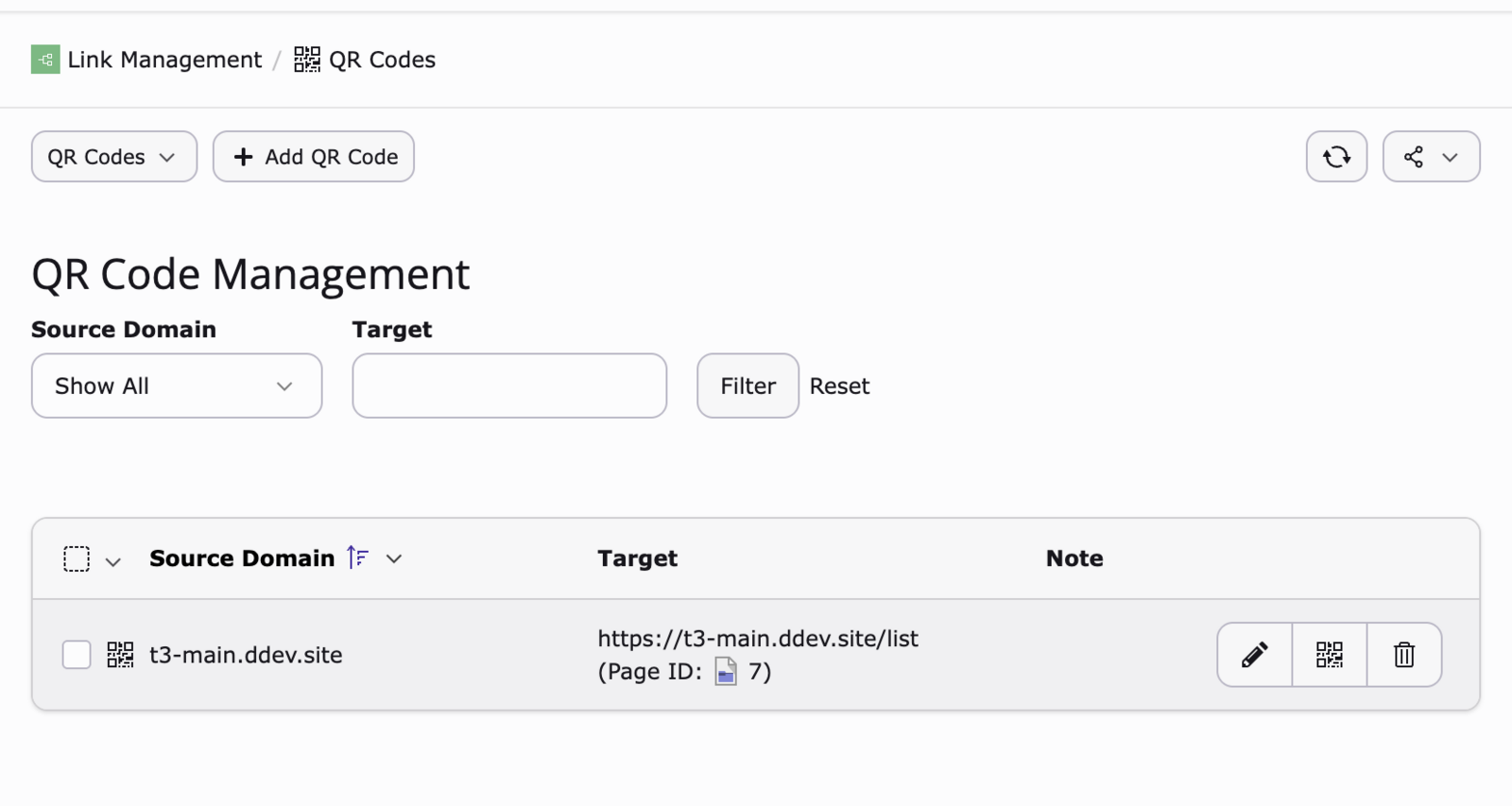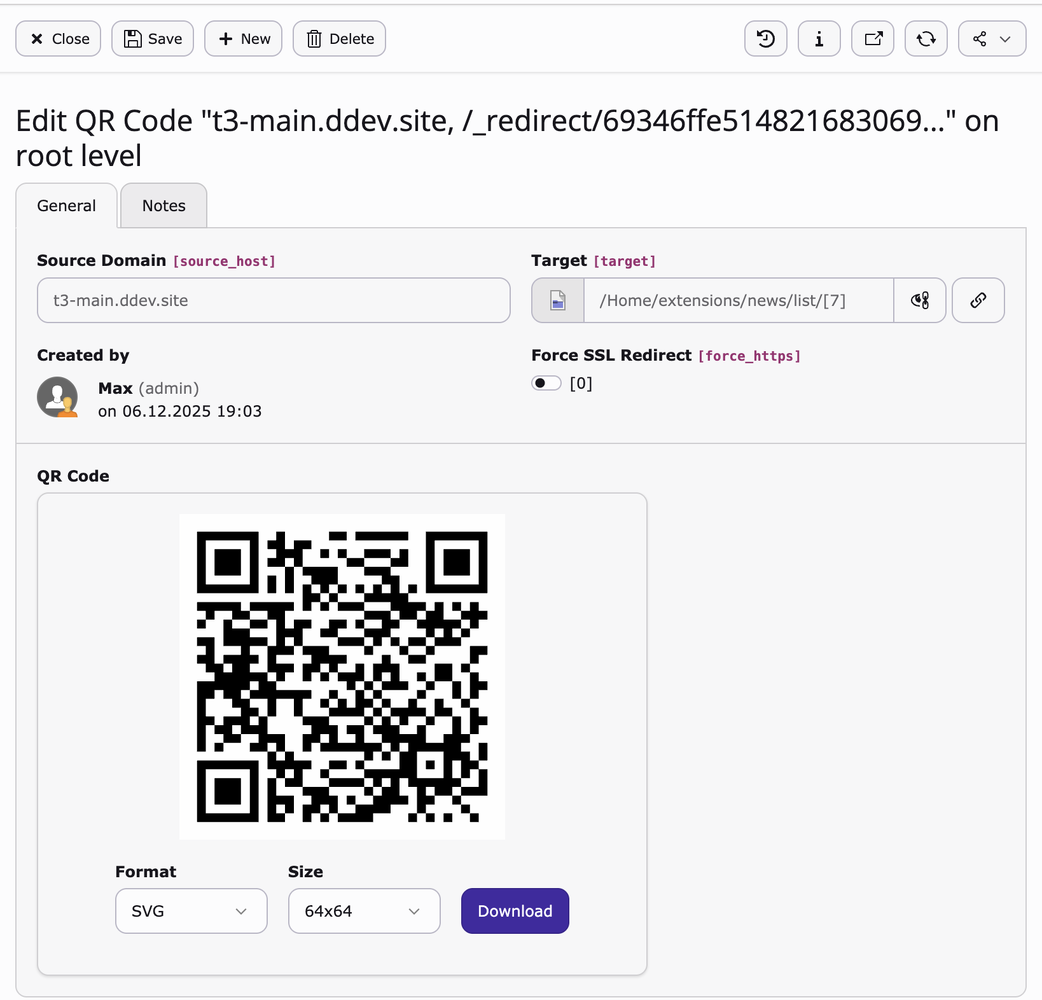 Dazu wurde die Tabelle sys_redirect erweitert, denn technisch werden die QR-Codes als Redirect abgelegt.