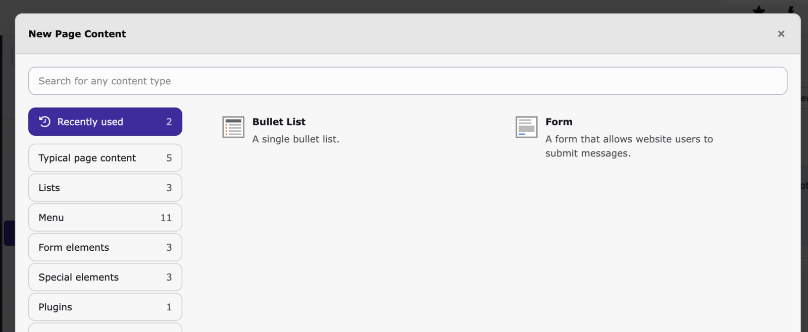 - Die Kategorien auf der linken Seiten wurden um den Eintrag "Zuletzt benutzt" ergänzt, in der - wie der Name verrät - die Inhaltselemente automatisiert abgelegt werden, die zuletzt benutzt wurden.