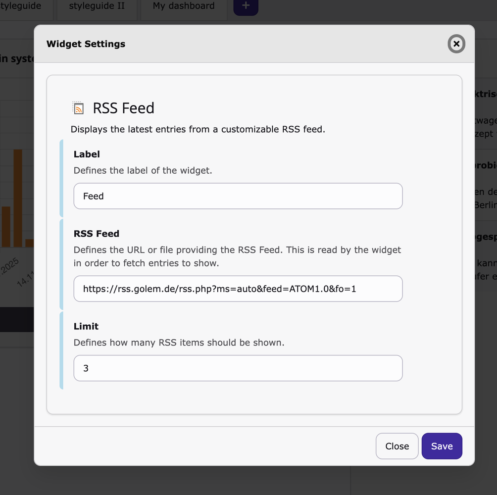 Widgets der Extension "Dashboard" können nun konfiguriert werden. Dafür wird die Settings API benutzt, die man schon von den Site Settings kennt. Dieses Feature stellt eines der letzten Puzzlesteine dar, der benötigt wurde, um Dashboards wirklich gut nützlich zu machen.